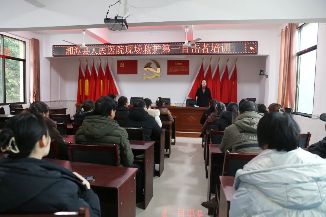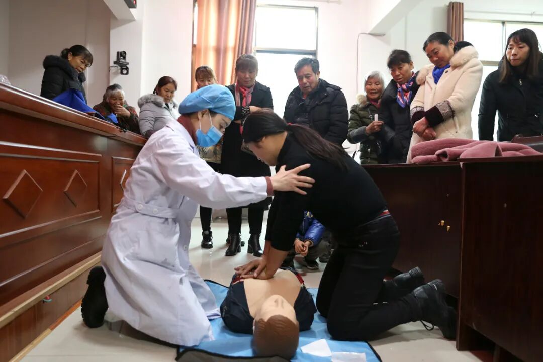 同時,在吳家村村委會會議室里,湘潭縣人民醫(yī)院第一目擊者導師團隊為基層工作人員及村里的年輕人進行了“第一目擊者”現(xiàn)場救護操作培訓,包括徒手心肺復蘇、海姆立克急救法等步驟清晰、易操作的急救方法。