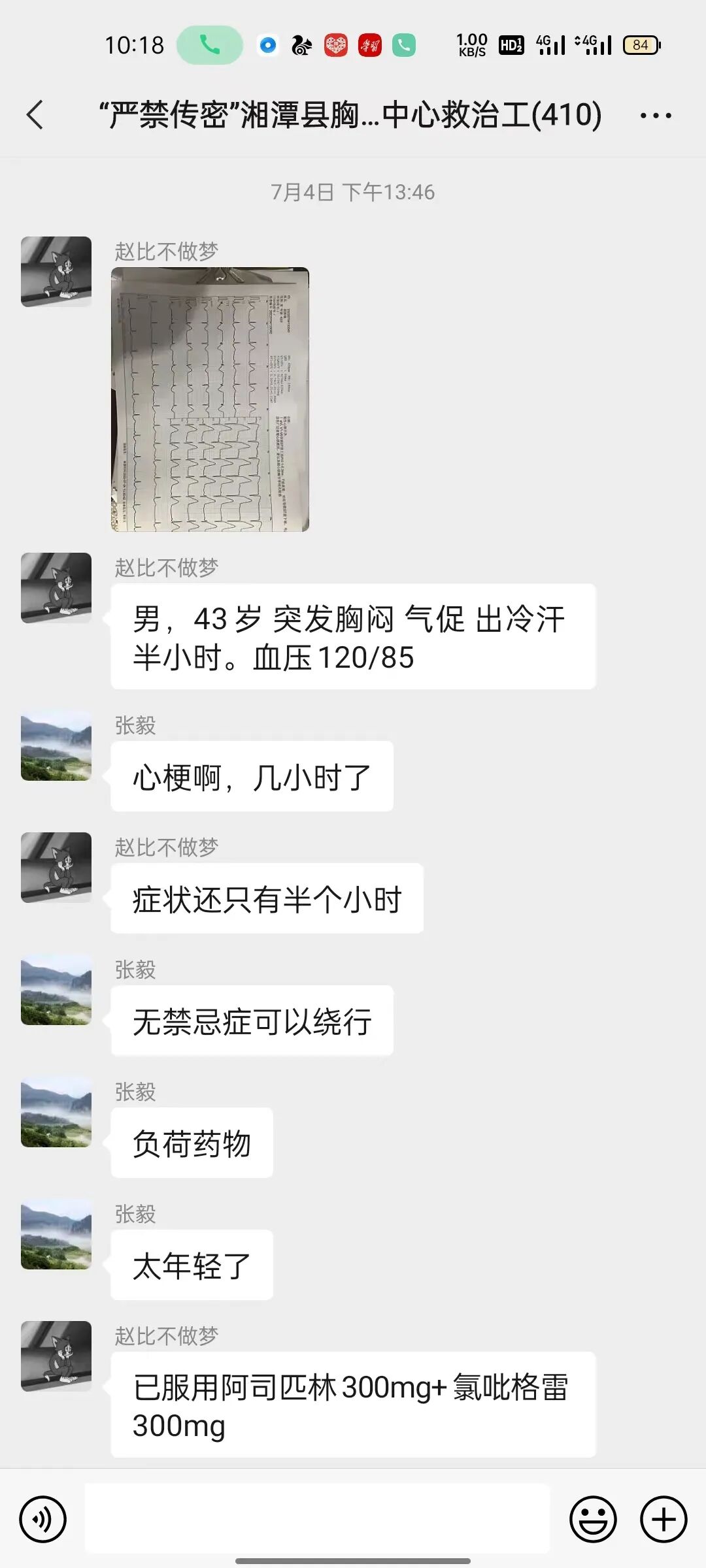 同時(shí),湘潭縣胸痛中心工作群里也傳來(lái)了一份心電圖及患者的病情介紹,患者是一位43歲的男性患者,突發(fā)胸悶、氣促、出冷汗半小時(shí),已服用阿司匹林300mg+氯吡格雷300mg。