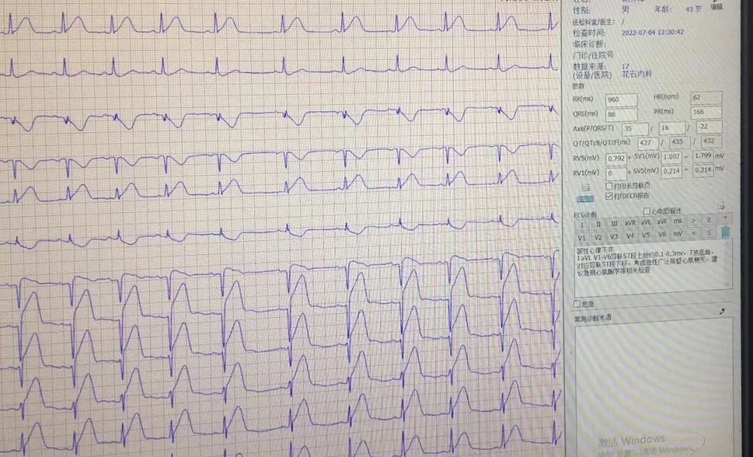 7月4日下午13:32分,湘潭縣人民醫(yī)院心功能科遠(yuǎn)程心電網(wǎng)絡(luò)系統(tǒng)接到了來(lái)自湘潭縣花石鎮(zhèn)中心衛(wèi)生院遠(yuǎn)程急診心電病例。